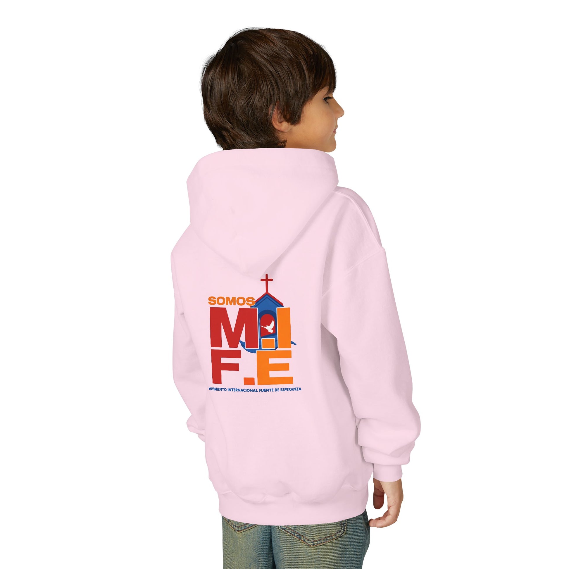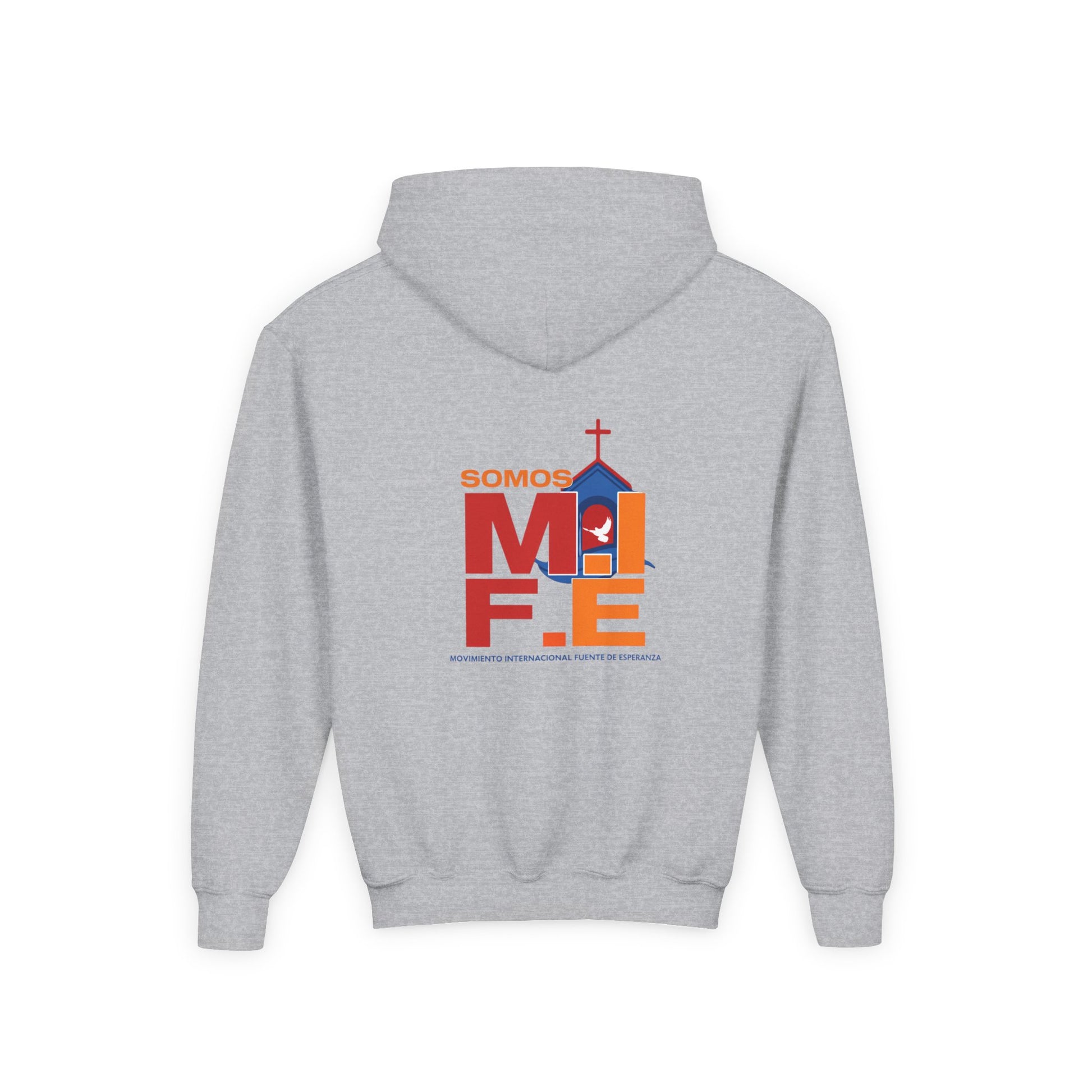 A cozy youth hoodie that carries a gentle faith-forward message. Soft, midweight fabric wraps kids in warmth while clean, embroidered lettering sits quietly on the chest. The back features a colorful, modern graphic with the phrase “SOMOS MIFE” and a stylized church silhouette—an uplifting, community-centered design that feels like belonging. Easy to pull on before school, Sunday gatherings, or neighborhood play, this sweatshirt balances durable construction with thoughtful details: a roomy kangaroo pocket for cold hands and small treasures, twill necktape for comfort, and reinforced cuffs that hold up through active days.